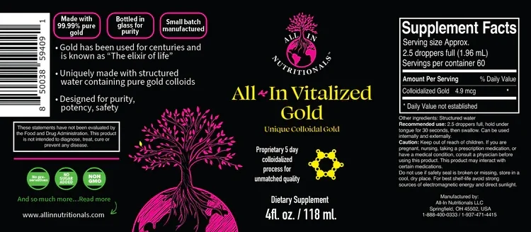 vitalized gold contains contains only two ingredients 99.99% pure gold tripple filterd vapor distilled structured water our small batch vitalized gold is created using a sophisticated electrolysis process to develop the smallest possible gold nano particles for maximum intakeand utilization a lot of people use the phrase small batch but dont define what that means... our vitalized gold batchs will nrvr exceed 200 bottles